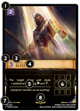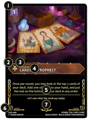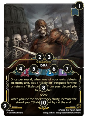 Karty te podobnie jak artefakty i zaklęcia można użyć po opłaceniu kosztu wyznaczonego w górnym lewym rogu. Będzie to się wiązało z efektem opisanym na dolnej połowie karty. W grze znajdziemy dobrze znane nam umiejętności jak: Łucznictwo, Płatnerz, Znajdywanie drogi, Taktyka czy umiejętności związane z magią różnych żywiołów.